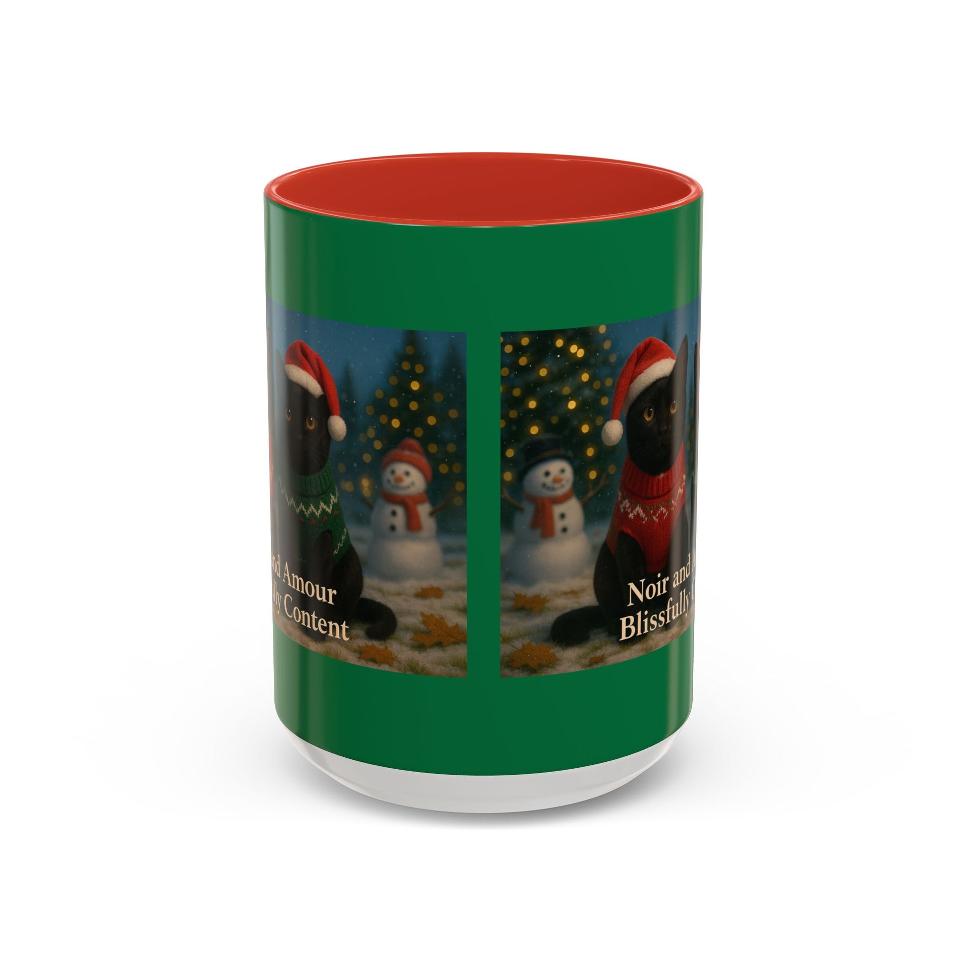 Bright, festive ceramic mug that brings cozy holiday cheer to morning coffee or evening cocoa. The glossy white body contrasts with a colored interior and handle for an eye-catching look. A winter scene wraps around the mug: two black cats in knit holiday sweaters and Santa hats perched before a softly lit Christmas tree and a smiling snowman — quiet humor for cat lovers who celebrate the season. The sturdy C-handle and smooth rim make sipping comfortable, while the vibrant printing keeps the illustration lively cup after cup. Use it on chilly mornings, at relaxed holiday gatherings, or whenever you want a small, comforting moment of seasonal whimsy.