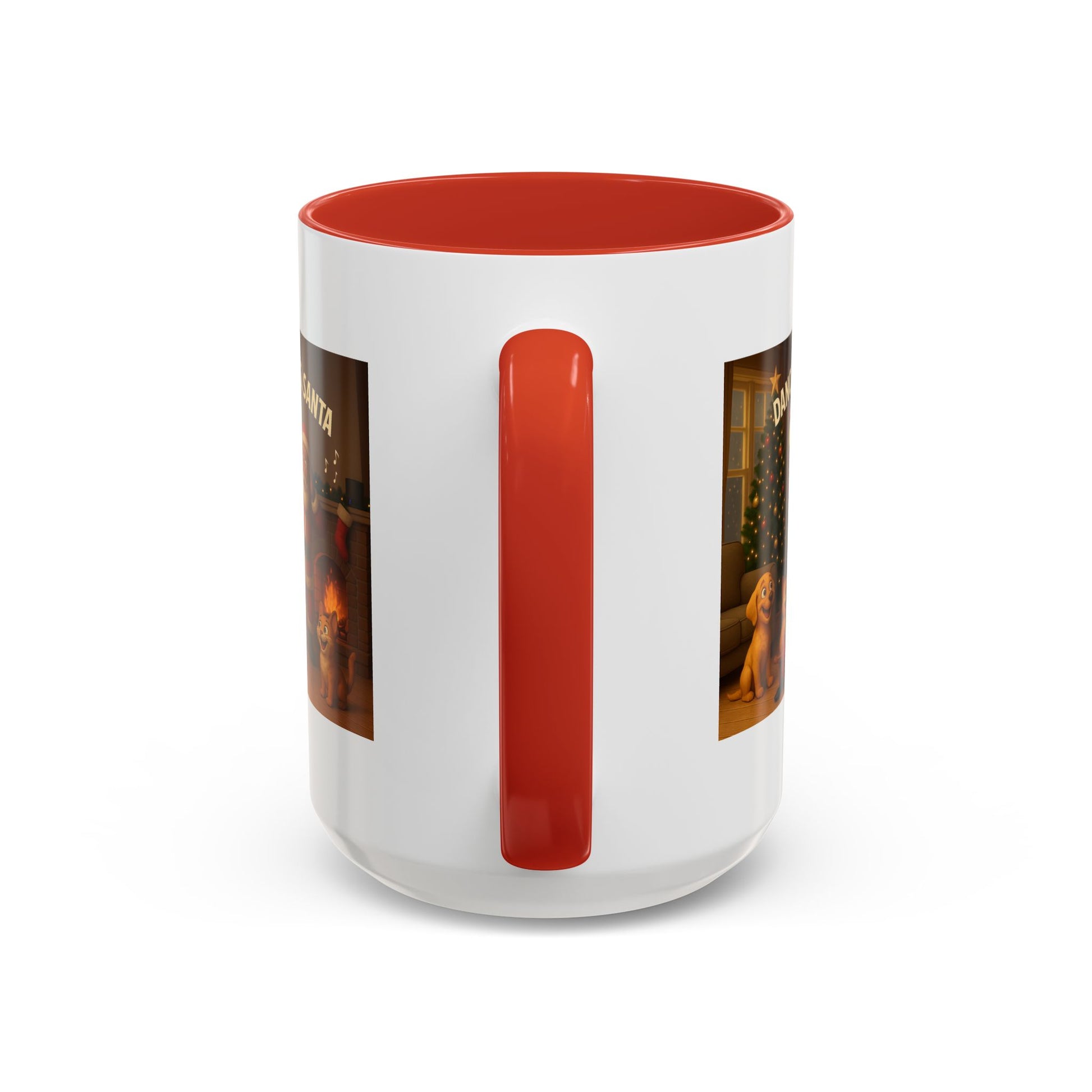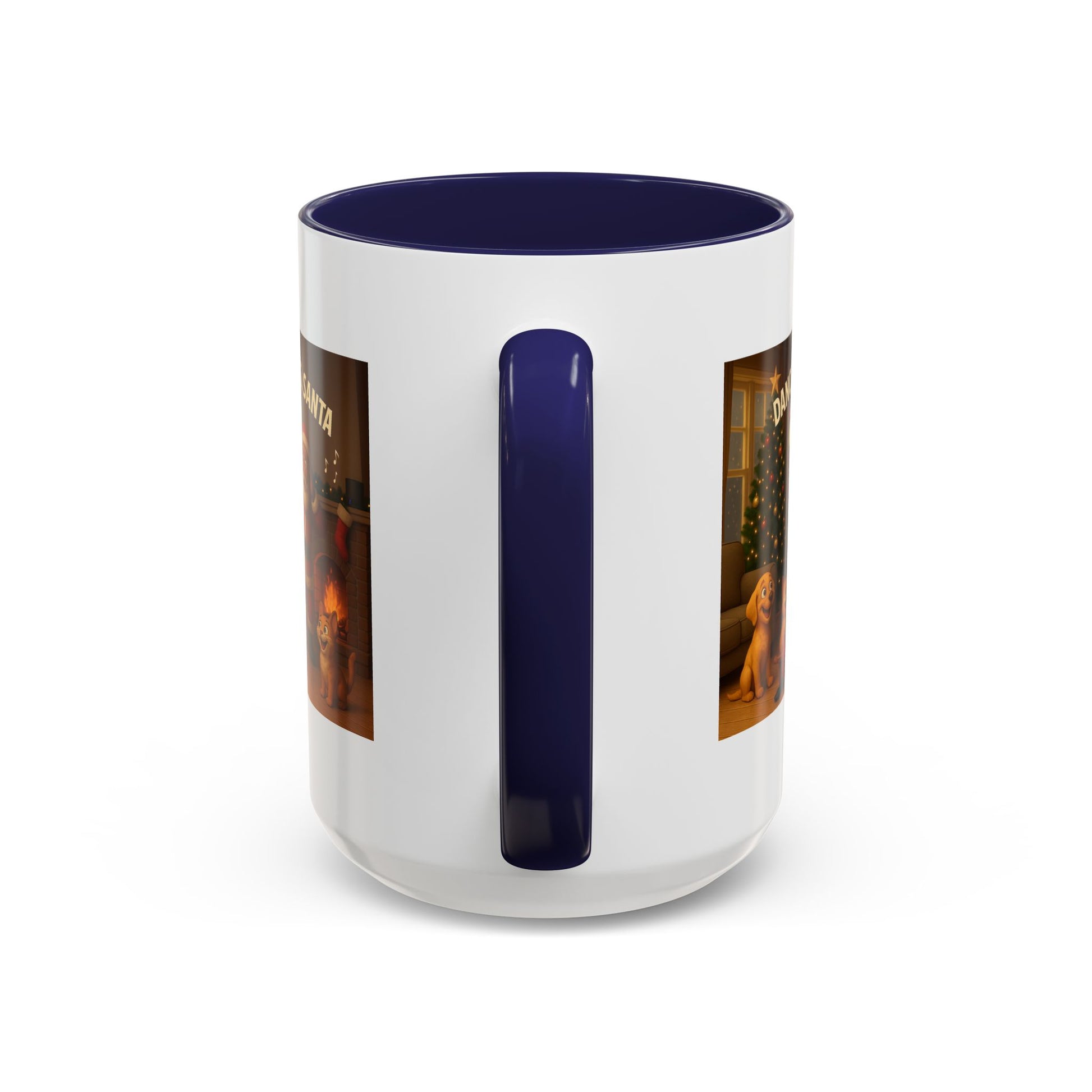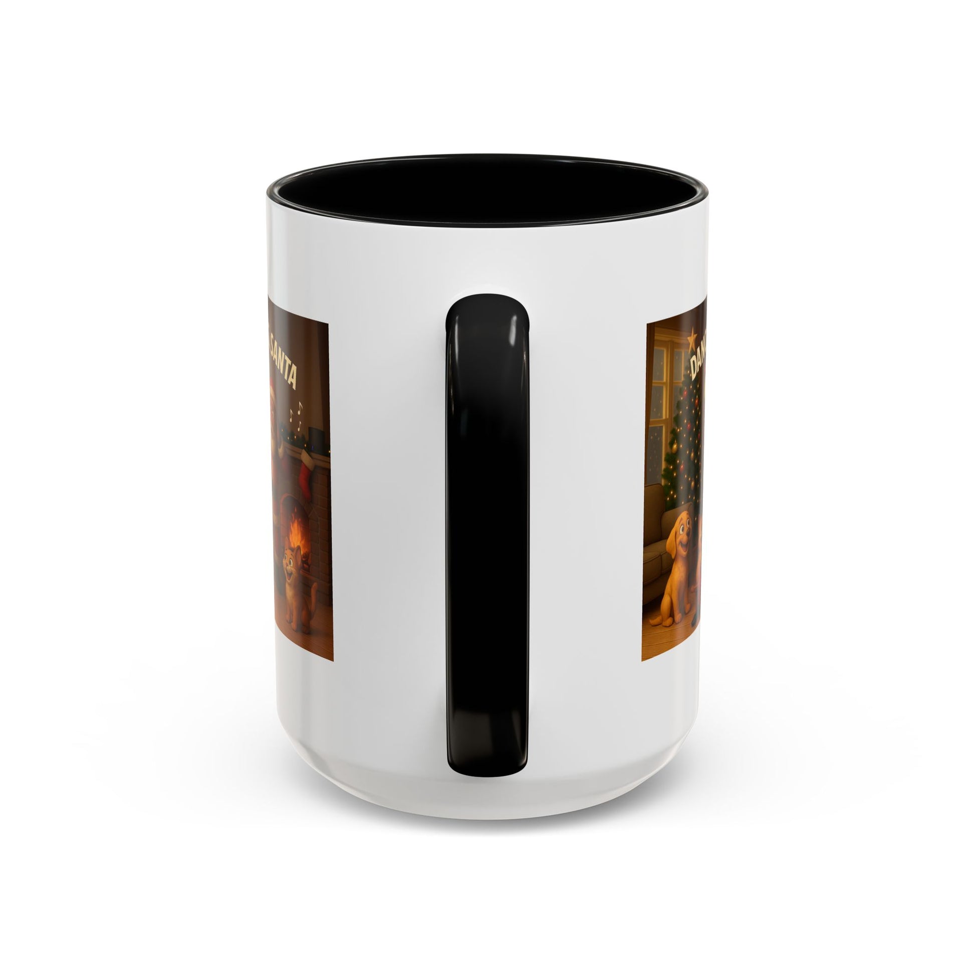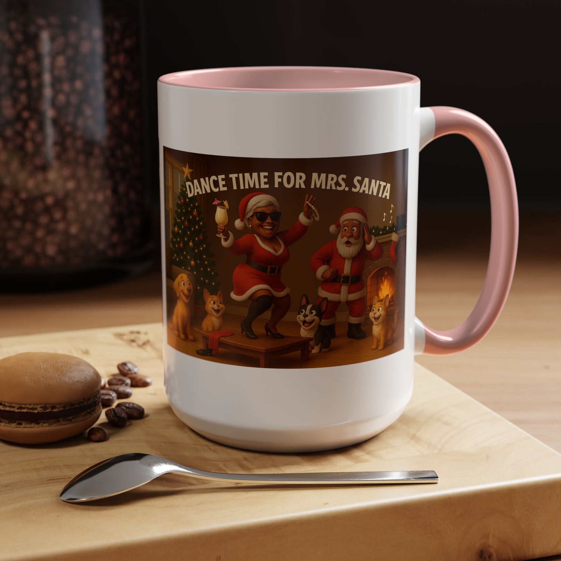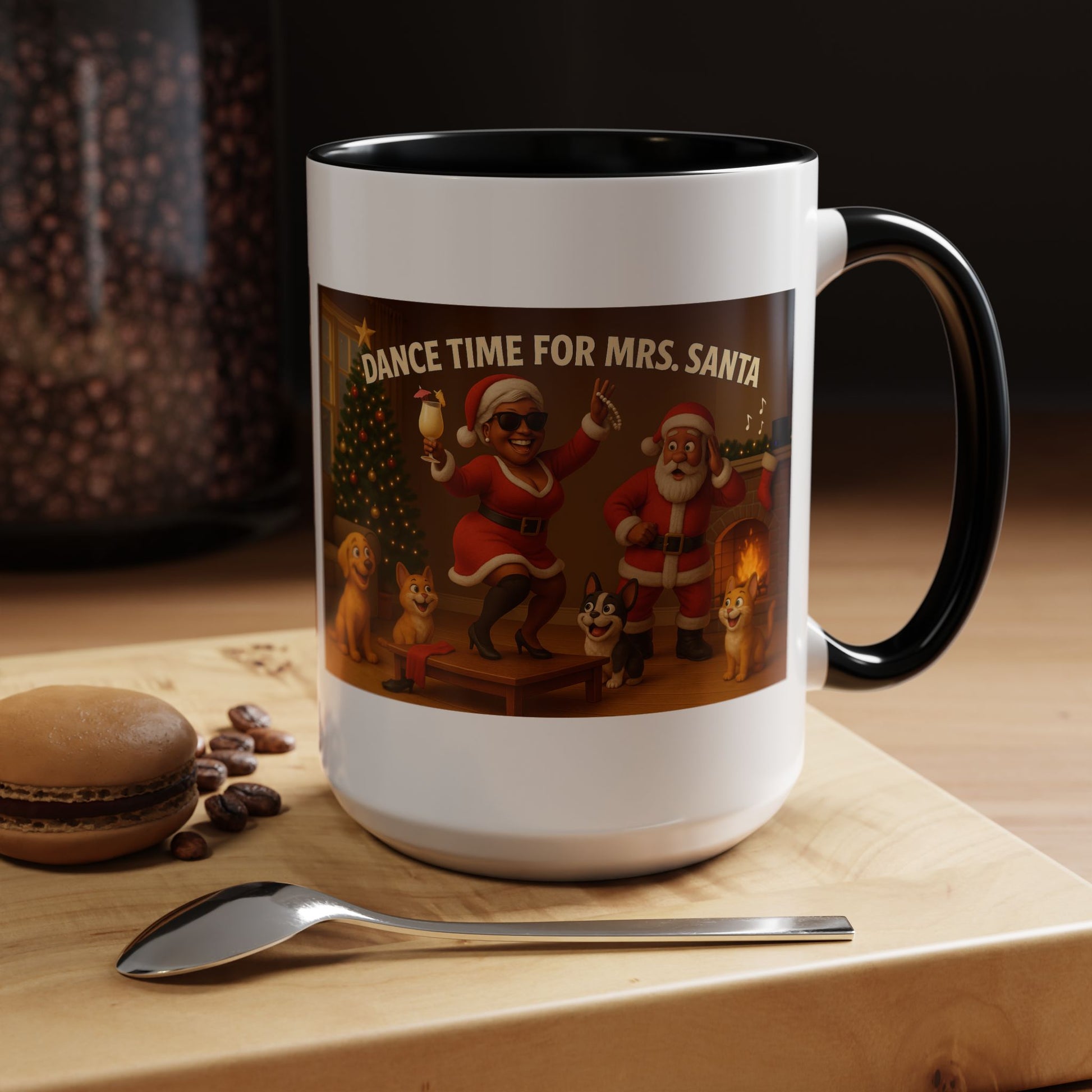 All eyes on Mrs. Claus. Our 3D “Dance Time for Mrs. Santa” (Black Mrs. Claus) shows her rocking the coffee table—sunglasses on, pearls twirling, piña colada & umbrella in hand—while Santa and the pets react. Warm, Christmassy living room art that’s perfect for gifting and daily sips. Warm, playful, and colorful — this ceramic Accent Coffee Mug brings holiday cheer to every sip. The glossy white body paired with a contrasting colored interior and handle frames a joyful scene of Santa, Mrs. Claus, and merry pups dancing by the fire and tree. It feels like a cozy evening by the hearth: hot cocoa steam, soft laughter, and twinkling lights. Use it through the season to brighten morning routines, serve warm drinks at a holiday gathering, or tuck it into a cozy gift basket for someone who treasures nostalgic, heartwarming décor.