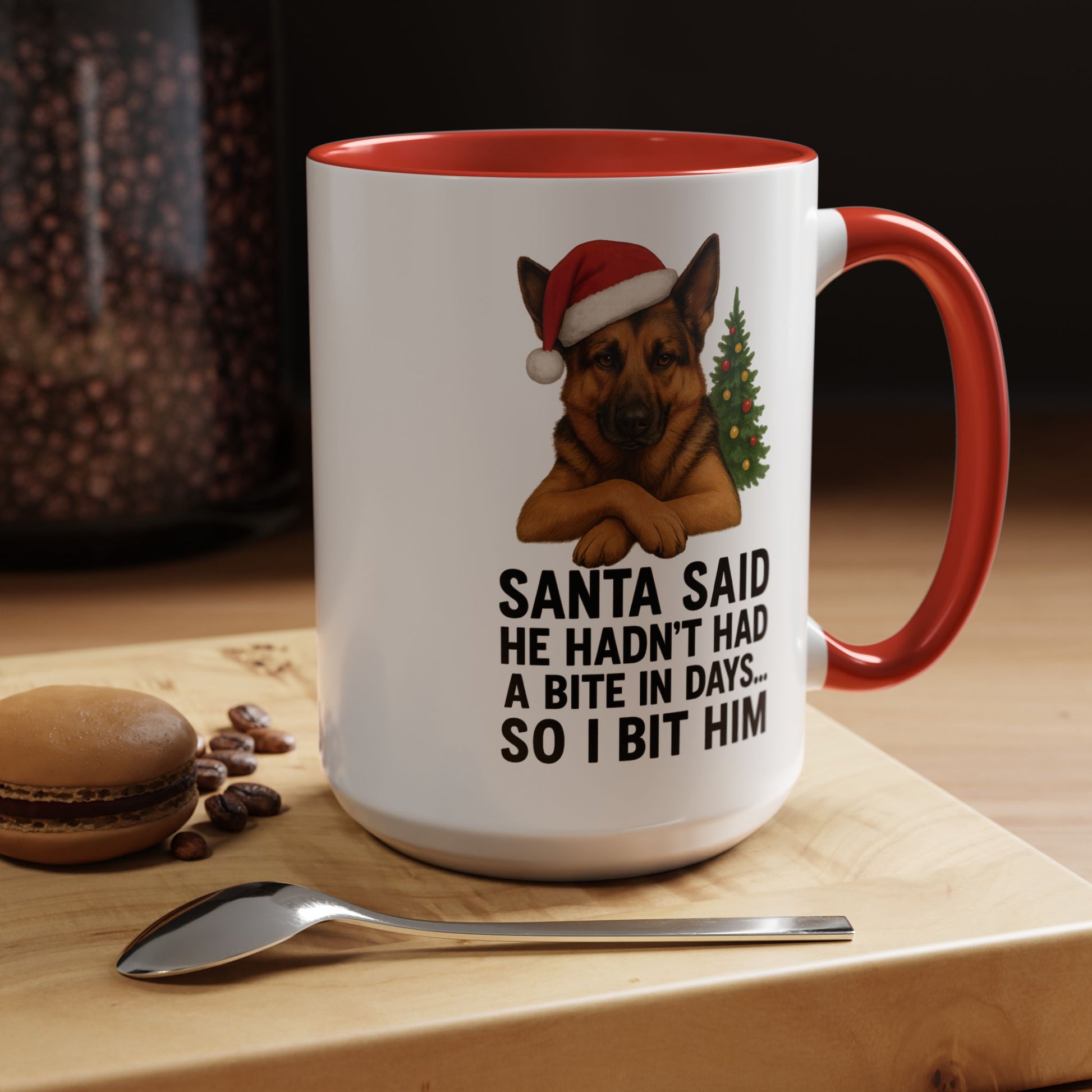 German Shepherd Christmas Mug – “Santa Said He Hadn’t Had a Bite in Days… So I Bit Him” vibrant Accent Coffee Mug. Perfect for coffee lovers and dog enthusiasts alike, this mug brings a playful twist to your daily routine. With a glossy finish and eye-catching color contrast, it adds a joyful sparkle to any kitchen or office space. Imagine cozy mornings filled with laughter and good vibes, where each cup becomes a conversation starter. This mug makes a wonderful gift for holidays, special celebrations, or just because; it’s ideal for anyone who enjoys a whimsical touch to their coffee experience. Whether you’re celebrating Christmas with family or brightening up a friend's day, this fun and functional drinkware piece is perfect for spreading cheer!